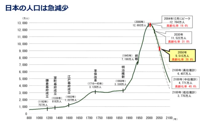 2004年をピークに人口は減り始めているのですが、寿命も延びているので2022年、23年はまだ山の頂上の方にいます。ただ、さすがにこの後からは、かなりの勢いで減っていきます。