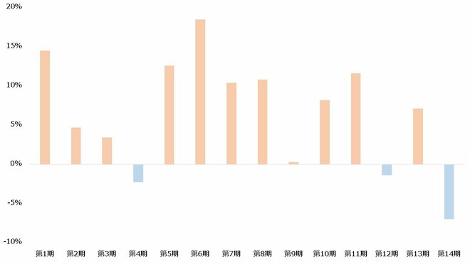 累積だけでなく期間収益も優秀で、設定から2022年3月までの第14期まで、パフォーマンスがTOPIX(配当込み)を下回ったことは3回しかありません。