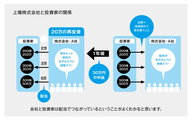 上場株式会社と投資家の関係を、下の図にまとめました。会社と投資家は配当でつながっているということがよくわかると思います。