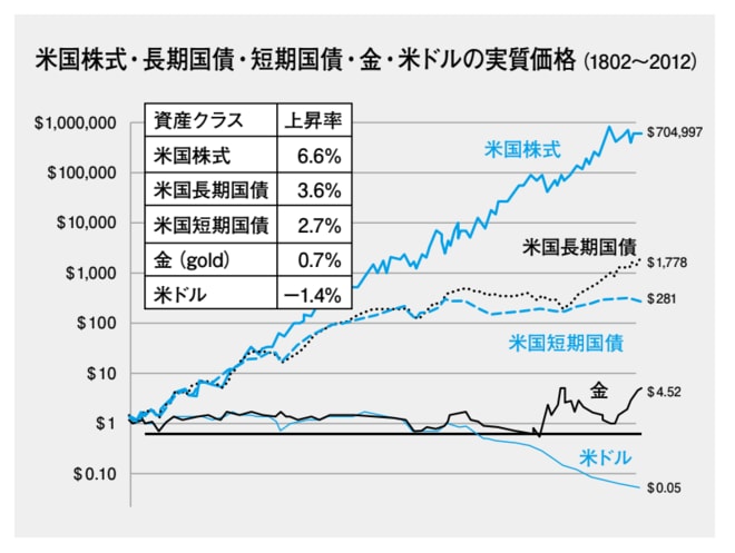 米国の株式、長期国債、ゴールド(金)、短期国債に投資した結果を描いています。期間は1802年〜2012年です。