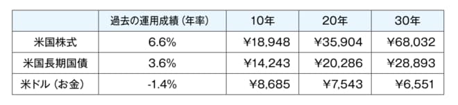株式投資と債券投資で、それぞれどのくらいお金を増やす力があるか表にまとめました。投資資金1万円が、10年〜30年でどれほど価値が増えるかを示しています。