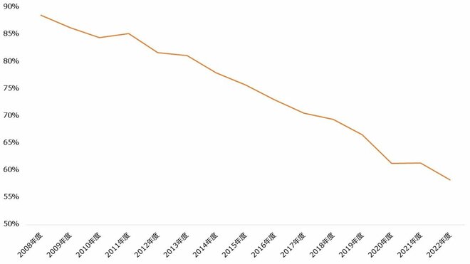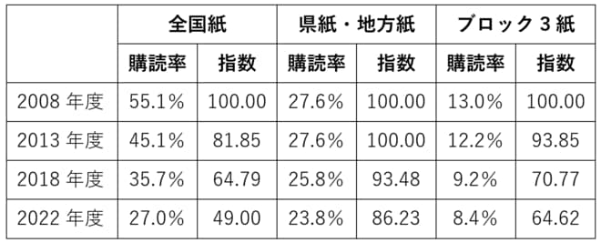 その代償か、新聞の購読率は低下し続けています。2008年度ではおよそ9割の人が購読していましたが、2022年度では6割を切りました。購読率の低下は特に全国紙で顕著に表れており、2008年度比で半分以下になっています。現在では新聞以外にもさまざまなメディアが登場し、情報源が多様化していることも理由の1つでしょう。