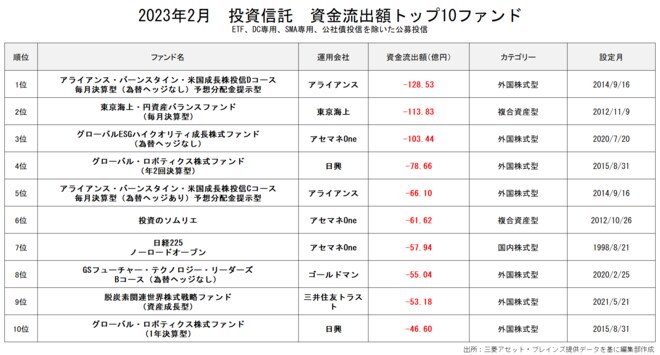 2月の資金流出額1位は「アライアンス・バーンスタイン・米国成長株投信Dコース毎月決算型(為替ヘッジなし)予想分配金提示型」(-128.53億円)