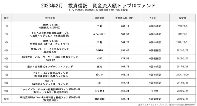 2月の資金流入額1位は「eMAXIS Slim 米国株式(S&P500)」(468.13億円)
