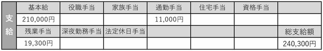 支給項目の大部分を占めるのが「基本給」。年齢や社歴、能力・経験などをもとに決められ、収入のベースとなる。勤怠項目において欠勤があると、基本給から欠勤分が差し引かれる場合がある。