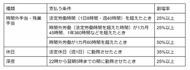 こうした割増率の規定を含め、時間外労働に対する手当の支給は、労働基準法に基づいた事業者の義務だ。残業代について、労働日や時間帯に応じて適正な金額が支給されているかをしっかりと確認したい。