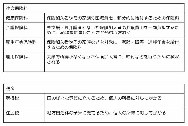 控除項目のメインとなる税金と社会保険料だが、多くの場合、下記項目が収入から天引きされる。