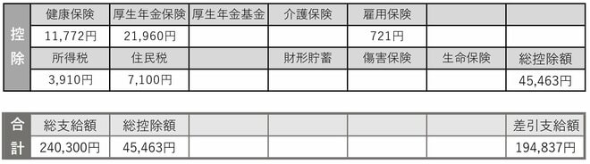 最後の「控除」項目では、総支給額から差し引かれる金額が記載されている。これにより算出された金額が、最終的な手取りとなる。