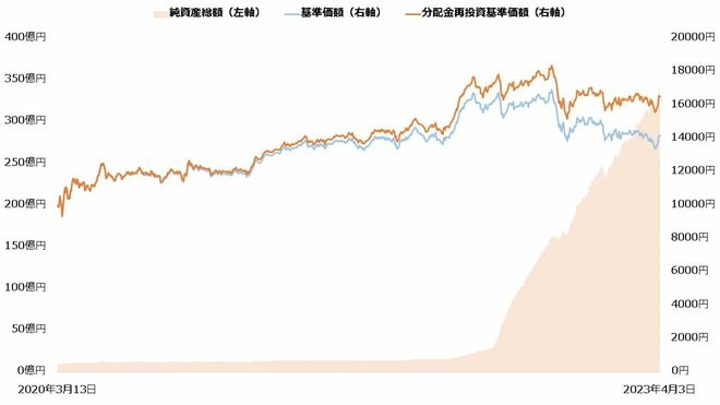 「東京海上・世界モノポリー戦略株式ファンド(毎月決算型)」に資金が集まっています。純資産総額は2022年6月ごろから顕著に増加し始め、2023年2月に初めて300億円に到達しました。