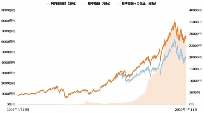 「netWIN GSテクノロジー株式ファンドBコース(為替ヘッジなし)」(以下:netWIN Bコース)は、1999年11月から運用される長寿ファンドです。近年に人気化し、2021年には純資産総額が8000億円を突破しました。やや減少したものの、今でも6500億円以上の資金を運用する大型ファンドです(2023年2月末時点)。