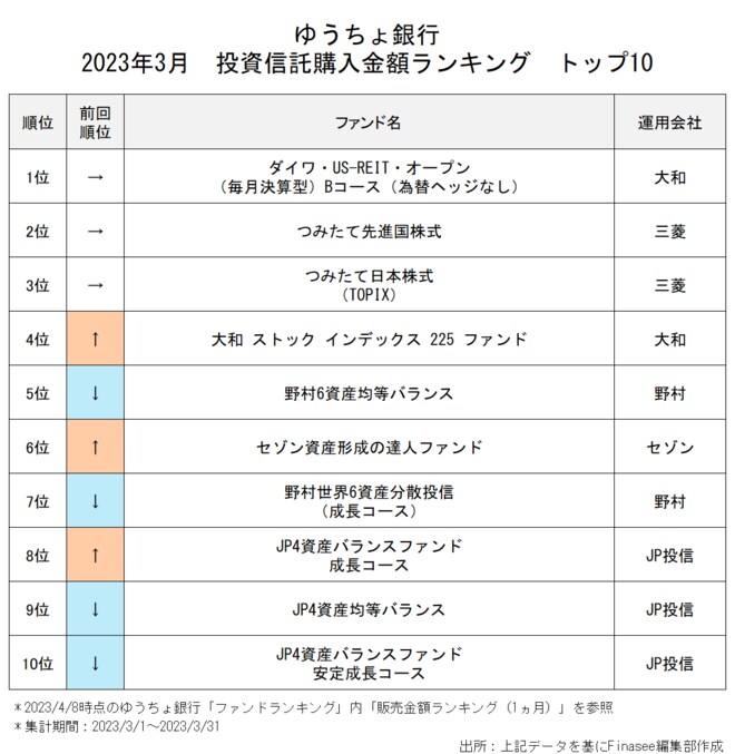 ゆうちょ銀行の3月ランキング1位は、「ダイワ・US-REIT・オープン(毎月決算型)Bコース(為替ヘッジなし)」だった。同ファンドは米国のリート(不動産投資信託)に投資し、配当利回りを重視した運用を行う。2月は1.8%のプラスリターンとなり、2月末時点における1年騰落率も4.4%だった。また、2月末時点におけるポートフォリオの配当利回りは3.9%となっており、4月以降もインカムゲイン狙いの買いが入る可能性は高いだろう。