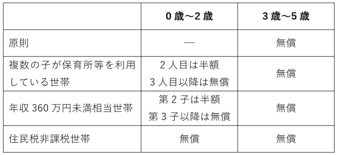 また複数の子どもが同時に保育所などを利用している世帯の場合、0歳~満2歳児クラスの利用料は2人目が半額、3人目以降は無料となります。うち年収360万円未満相当世帯の場合、1人目の年齢条件は問いません。従って、この世帯は第1子が小学1年生以上の年齢になっていても、0歳~満2歳児クラスの第2子は半額、第3子以降は無料となります。