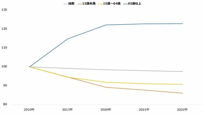 総務省は4月に人口推計を発表しました。2022年10月時点における日本の総人口は1億2494万7000人となり、12年連続の減少となっています。減少率は15歳未満で約14%、15歳~64歳で約9%となりました。対照的に、65歳以上の人口は約23%増加しています。