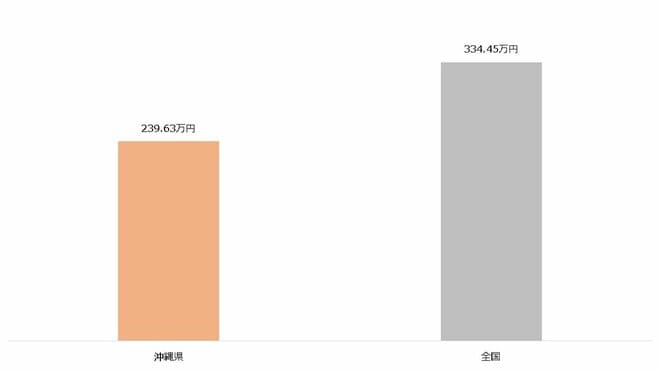 一方、沖縄経済の弱点としてよく挙げられるのが、1人あたり県民所得の低さです。県内の個人や企業が生み出した所得を県民1人あたりに直した数値のことで、沖縄県は全国最下位となっています。2019年では約240万円で、これは全国平均の7割ほどしかありません。
