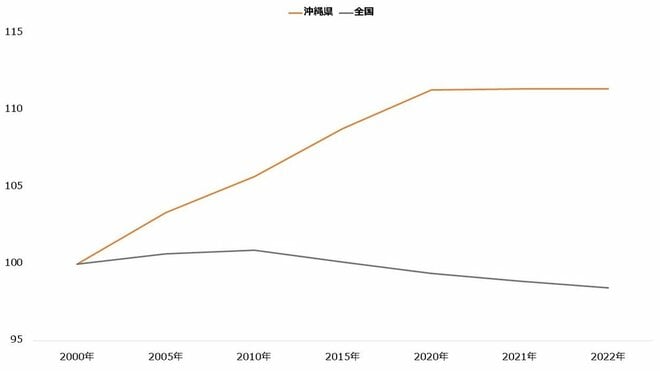 増加する人口も、沖縄経済の強みです。総務省の「人口推計(2022年)」によると、2022年10月1日時点の沖縄県の総人口は146万8000人と推計されており、2000年比でおよそ15万人、本土復帰した1972年比ではおよそ50万人増加しました。