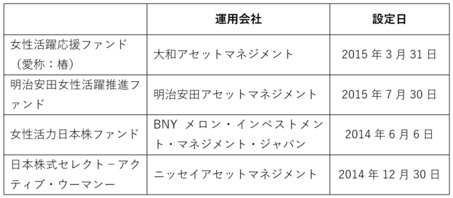 上場しない通常の投資信託にも、女性の活躍をテーマとする銘柄があります。女性を積極的に活用する企業や女性の活躍を助けるような事業を展開している企業など、いずれも女性の活躍をテーマとしてファンド独自に銘柄を選定します。