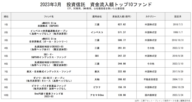 3月の資金流入額1位は「eMAXIS Slim 米国株式(S&P500)」(627.62億円)