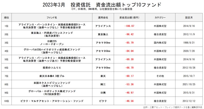 3月の資金流出額1位は「アライアンス・バーンスタイン・米国成長株投信Dコース毎月決算型(為替ヘッジなし)予想分配金提示型」(-186.07億円)
