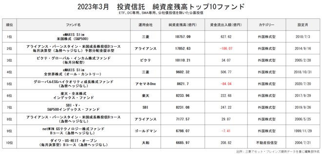 3月の純資産残高1位は「eMAXIS Slim 米国株式(S&P500)」(1兆8757.09億円)
