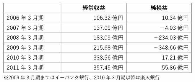楽天グループとの関係は、業績不振に苦しんでいた2008年に始まります。当時のイーバンク銀行は2006年3月期に初めて黒字化したものの業績は安定せず、さらにサブプライムローン問題などで深刻な赤字を計上していました。