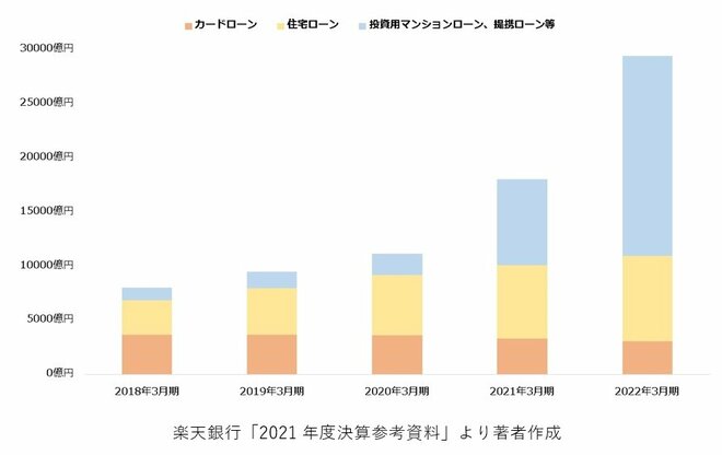 また貸出金の増加も、楽天銀行の好調な理由の1つです。近年は特に提携ローンや投資用マンションローンの増加が顕著で、全体の貸出金は2022年3月期で約2兆9000億円に上りました。