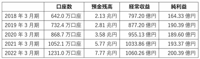 楽天銀行の直近の業績は以下の通りです。近年は口座数や預金残高が飛躍的に増加し、売上高に相当する経常収益も1000億円台に乗りました。