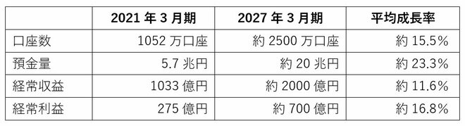 このように快走している楽天銀行ですが、今後はどれほどの成長を目指しているのでしょうか。同行が2022年4月に定めた「中長期ビジョン」によると、2027年3月期までに約2500万の口座数、約2000億円の預金量などの達成を目標としています。仮にこの通りに進捗した場合、楽天銀行は毎年2桁成長を果たす計算です。