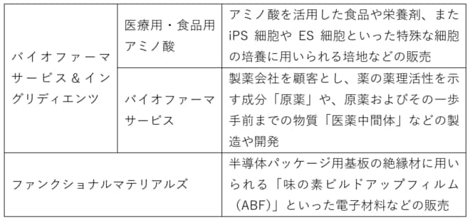 ヘルスケア等事業は、医療分野などの「バイオファーマサービス&イングリディエンツ」と、半導体向け材料などの「ファンクショナルマテリアルズ」で構成されています。事業利益は前者で約162億円、後者で289億円と、意外にも半導体向け材料の方が大きくなっています(2022年3月期)。