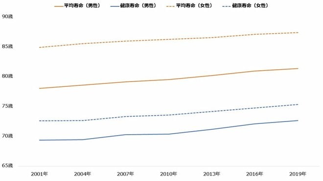 高齢者が活躍する背景には健康寿命の延びがあるでしょう。「健康上の問題で日常生活が制限されることなく生活できる期間」のことで、2019年では男性で72.68歳、女性で75.38歳となりました。両性ともに延伸しており、年齢が進んでも元気なシニア層が増えている様子がうかがえます。