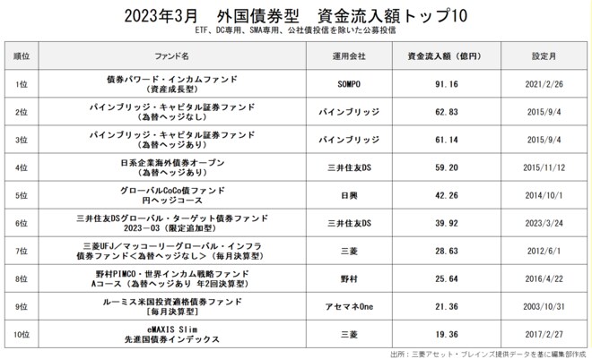 3月の資金流入額1位は「債券パワード・インカムファンド(資産成長型)」(91.16億円)