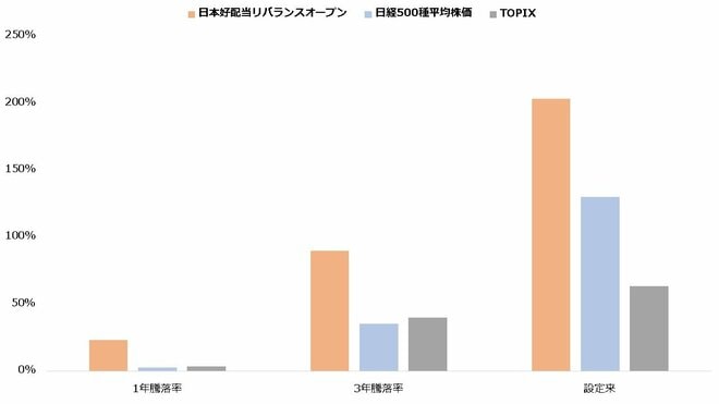 もっとも、日本好配当リバランスオープンが良好な成績を収めたのは2022年に限りません。直近の1年間や3年間では日経500種平均株価やTOPIXを上回るリターンを残しており、設定来でもこれらの指数を大きく超えるリターンを獲得しています(2023年4月7日時点)。