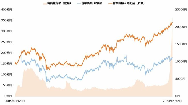 日本好配当リバランスオープンの純資産総額は2023年に急増していますが、これは前年の良好なパフォーマンスが注目されたためだと考えられます。