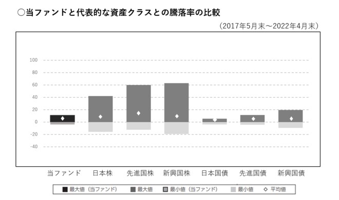 参考情報として、過去5年の「代表的な資産クラスとの騰落率の比較」について、下記のように帯グラフなどデータがまとめられています。他の資産クラスにくらべて、平均値が高いのかどうかや、最大値と最小値の幅から、いい時と悪い時のブレ幅を確認できます。特に、市場の状況によっては悪い時の最小値ぐらいに下落することを改めて確認しておくといいと思います。