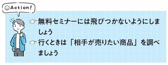 無料セミナーに行こうか悩んだときは、必ず主催会社と何を売っているかを調べて、「行ったら売られるかもしれない商品」を確認してください。その会社がすでに利用しているところであれば大きな問題はないでしょう。学ぶことだけを目的に一切何も買わない強い意志を持って参加するのもアリです。とはいえ、セミナー後には営業電話が何度もかかってくる可能性も。そのことを覚悟の上で検討しましょう。