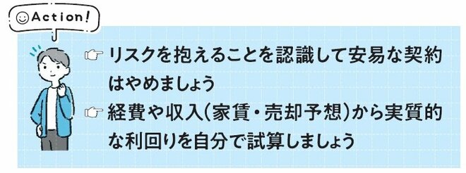セミナーですすめられるワンルーム投資では、少しの頭金で投資用ローンを組み、入居者募集も管理も業者に任せることが多いので、誰でも手軽にできそうと感じられるかもしれません。しかし不動産投資はそんなに甘いものではありません。大きなリスクを抱えることを理解せずに安易に契約する人もいるため、注意が必要です。業者から「節税」「老後の年金代わり」などといわれる物件は要注意です。リターンが小さい、つまり割高な物件を買わせるときの決まり文句だからです。