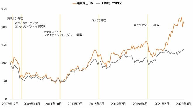 その後も数千億円規模の大型買収を相次いで実施しており、主要な案件だけでも累計の買収額は2兆円を超えます。投資家もこれを評価したのか、株価は2007年末のおよそ2倍の水準にまで上昇しました(2023年4月末時点)。
