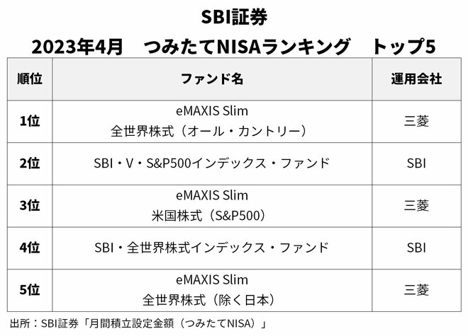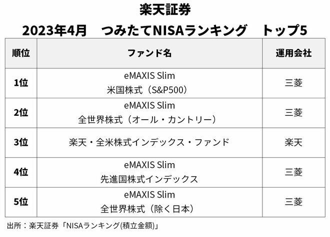 SBI証券で3位、楽天証券で1位の「eMAXIS Slim 米国株式(S&P500)」は、米国を代表する株価指数であるS&P500種株価指数(配当込み、円換算ベース)に連動する投資成果を目指すインデックスファンドである。2023年1月までアクティブファンドの「アライアンス・バーンスタイン・米国成長株投信Dコース毎月決算型(為替ヘッジなし)予想分配金提示型」が19カ月連続で純資産残高1位の座をキープしていたが、2月に「eMAXIS Slim 米国株式(S&P500)」が1997年10月以来、およそ25年ぶりにインデックスファンドとして1位になった。同ファンドは「つみたてNISA」の対象ファンドとなっており、毎月、高水準の資金流入が続いている。3月は約627億円の資金流入があり、これは国内公募の追加型株式投資信託の中で最大である。また、純資産残高は1兆8757億円となり、2位の「アライアンス・バーンスタイン・米国成長株投信Dコース毎月決算型(為替ヘッジなし)予想分配金提示型」の約1兆7852億円と差を広げた。SBI証券と楽天証券のNISA積立設定金額ランキングでも上位に入っており、今後も高水準の資金流入が続く可能性が高いだろう。