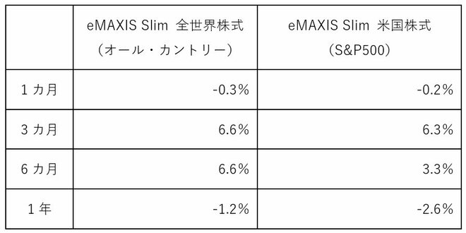 また、3月末時点における「eMAXIS Slim 米国株式(S&P500)」との騰落率を比較すると、以下のようになる。