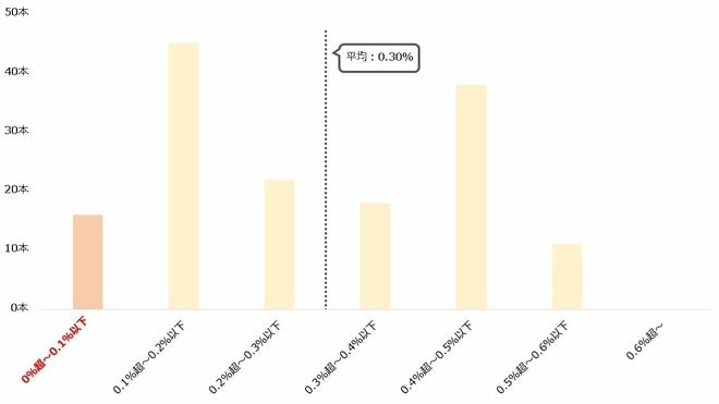eMAXIS Slim米国株式(S&P500)は、これまで信託報酬を相次いで引き下げてきました。現在は0.09372%となっており、これは信託報酬が一定以下に限られる「つみたてNISA」対象銘柄の中でも最低水準です。例えば内外または海外に投資するつみたてNISA対象のインデックスファンドで、信託報酬が0.1%以下の銘柄は全体のおよそ1割しかありません。