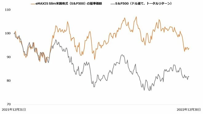 特に2022年は、本家のS&P500を上回るパフォーマンスを獲得しています。これは円安が顕著に進んだためです。アメリカで金利上昇が強く意識されたことから、株式市場は軟調な推移となりましたが、米ドルは日本円に対して大きく値上がりしました。このため、円で換算されるeMAXIS Slim米国株式(S&P500)は、ドル建てのS&P500よりも小さな値下がりにとどまっています。