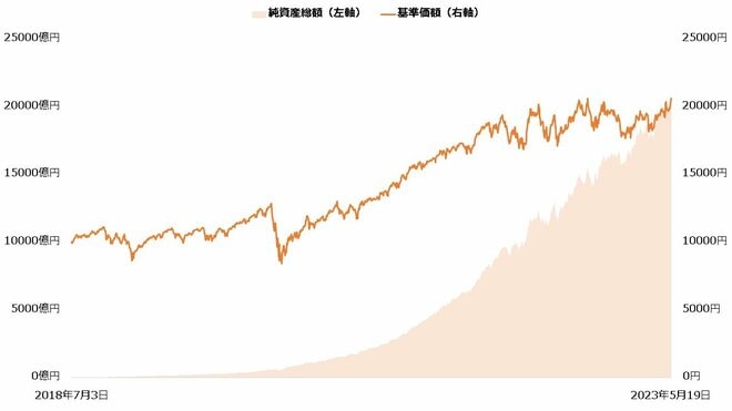 「eMAXIS Slim米国株式(S&P500)」の勢いが止まりません。当初設定額はわずか100万円と極めて小規模のスタートでしたが、資金流入が続き、2023年5月には純資産総額が2兆円を突破しました。設定から実に200万倍に増加したことになります。同年2月には、ETFを除く全ての公募投資信託で最大の純資産総額を持つ銘柄となりました。