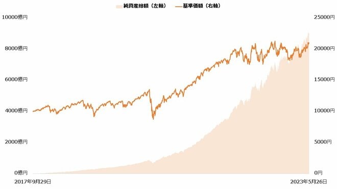 2023年5月、「楽天・全米株式インデックス・ファンド」(愛称:楽天・VTI。以下同)の純資産総額が9000億円を突破しました。ほぼ全てのアメリカ株式に投資する銘柄で、運用資産は設定から右肩上がりに増加しています。