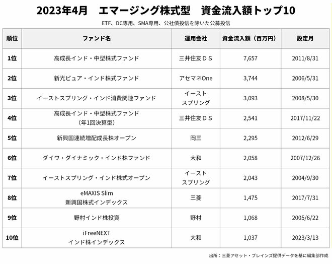 4月のエマージング株式資金流入額1位は「高成長インド・中型株式ファンド」(76.57億円)