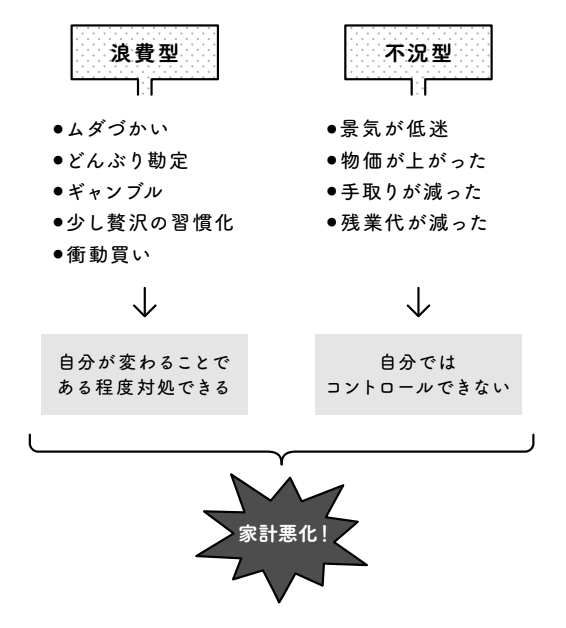 ですが、原因を大きく分けると、ムダづかいや贅沢、無謀な遊興費やギャンブルといった「浪費型」から、景気低迷による「不況型」に分かれます。