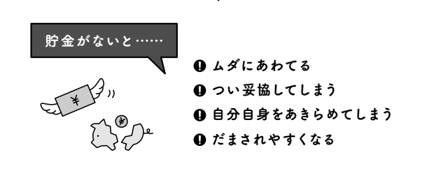 貯金がないことにより、あわてたり、妥協したり、自分自身をあきらめたり、だまされやすくなります。ふだんなら決して手を出さないカードローンなどで生活費を借り、返済に追われて、転落人生を歩む人もいるのです。