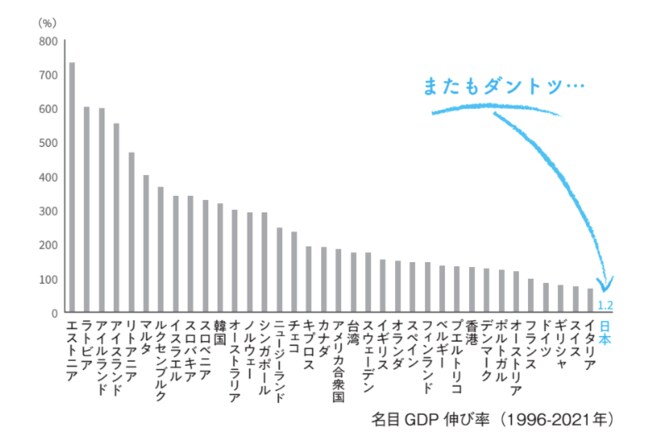 太郎:日本は1.2%しか伸びてないから、これもまた、ダントツでビリだね。次に伸びてないイタリアですら69.8%。日本は文字どおり桁違いに伸びてない。