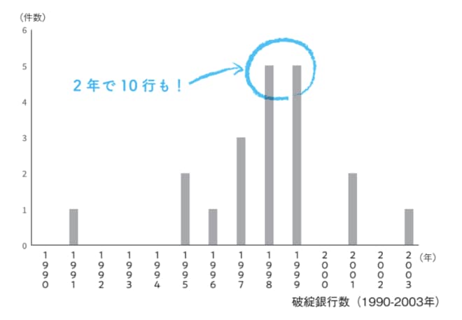太郎:1998年と1999年は2年連続で5行も破綻したのか。そして1990~2003年の間に合計で20行も破綻したんだね。