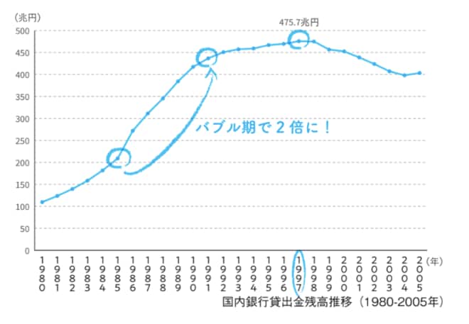 太郎:バブル期の貸出金残高の伸びがすごいね。1985年は209兆円だったのに、1991年には436.7兆円まで伸びている。バブルの間に倍以上になったんだね。
