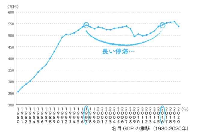 そこからしばらく横ばいになって、1997年の475.7兆円がピーク。翌年の1998年から下落に転じているね。