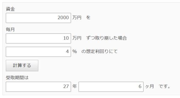 ですが金利1%で運用しながらだと? 金利4%で運用しながらだと? 簡単には計算できません。しかし、安心してください。本当に便利な早見表があるんです!と、言いたいのですが残念ながら早見表はありませんので、ネットで「金融電卓」と検索してください。ご自身の取り崩しをシミュレーションできるサイトが検索できます。そこで、今ある資金、毎月の受け取りたい金額、想定する運用利回りを入力すると、年数を計算してくれます。